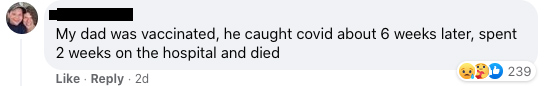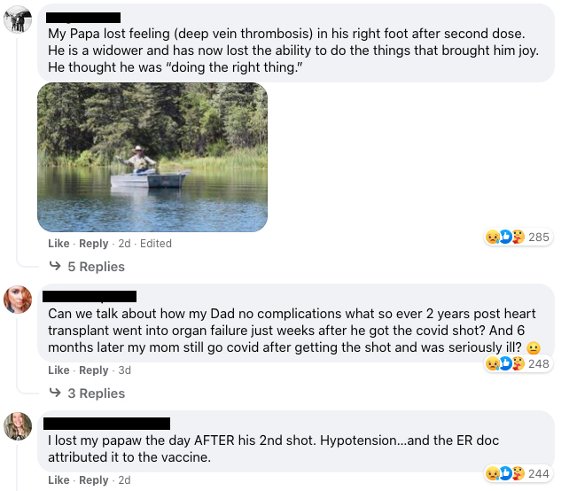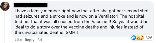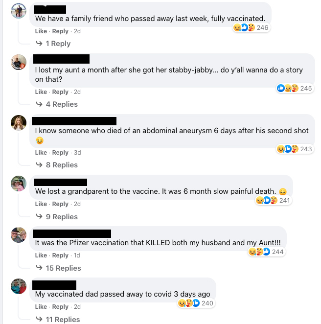 Cu toate acestea, în loc de poveștile celor nevaccinați, postarea de pe Facebook a postului de știri a fost inundată de poveștile despre leziunile provocate de vaccinuri ale unor mii de oameni disperați să se facă auziți, într-un timp al cenzurii dure.