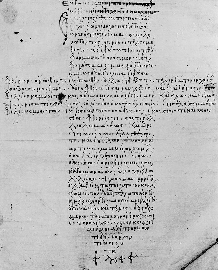 „Binecuvântat să fie Dumnezeu, Tatăl Domnului nostru Iisus Hristos, care este binecuvântat în veci! Nu voi păta în niciun fel învățarea artei medicinei. Nu voi da otravă nimănui, dacă mi se va cere și nici nu voi iniția o asemenea sugestie. De asemenea, nu voi da niciunei femei tratament de avort, fie oral sau vaginal. Dar voi preda această artă celor care doresc să o învețe, fără salariu sau angajament.