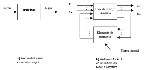La baza automaticii se află studiul automatelor. Automatul este un concept abstract care derivă direct din noţiunea de sistem cu reacţie negativă (feedback), având cinci componente: S – mulţimea stărilor interne; X – mulţimea intrărilor în automat, provenite din exterior; Z – mulţimea ieşirilor generate de automat către exterior; f – funcţiile de tranziţie; g – funcţiile de ieşire. Aşadar, automatul este un cvintuplu: A = {S, X, Z, f, g}.
