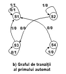 De exemplu, pentru automatul A1: dacă automatul este în starea S2 şi primeşte intrarea “0”, el va trece în starea S3 cu ieşirea 0; dacă este în starea S2 şi primeşte intrarea “1”, va trece în starea S2 cu ieşirea 0.