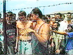 – refugiaţii se aflau în afara gardului de sârmă ghimpată, iar fotograful, înăuntru;