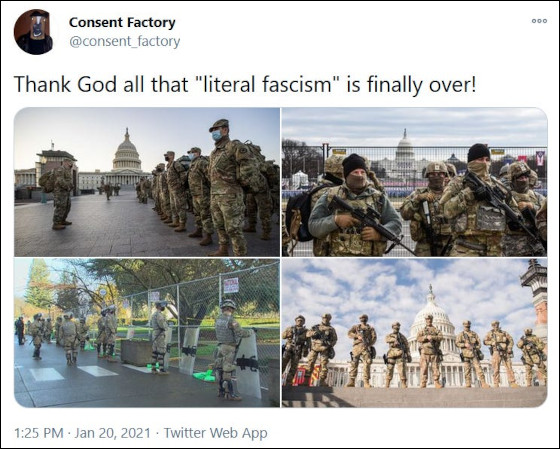 Așa-numitul „asalt violent asupra Capitoliului” a pregătit scena pentru evenimentul principal, care a fost demonstrația de forță ulterioară. Cineva (nu e în totalitate clar cine) a ordonat descinderea a [25.000] de trupe, închiderea Washingtonului, ridicarea de garduri, a introdus blocaje rutiere și puncte de control militare, ocupând altfel districtul guvernamental. Situația arăta ca în orice altă ocupație militară americană de după „schimbarea de regim”, pentru că, de fapt, asta a fost și asta s-a dorit. (…)