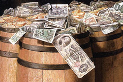 În a doua parte a dramei Faust, publicată postum, acţiunea se petrece în curtea aflată în faliment a unui împărat hedonist. Trezorierul imperial anunţă că „lăzile cu bani sunt goale”, la fel şi cramele, din cauza petrecerilor frecvente. Însă influentul Mephisto propune transformarea hârtiei în bani. Împăratul îndatorat este uimit: „M-am săturat să tot caut soluţii / Nu avem bani, faceţi ce a spus”. Bancnotele semnate de împărat declanşează o explozie a consumului, „jumătate din popor fiind obsedată să mănânce bine / cealaltă jumătate să se îmbrace bine”.
