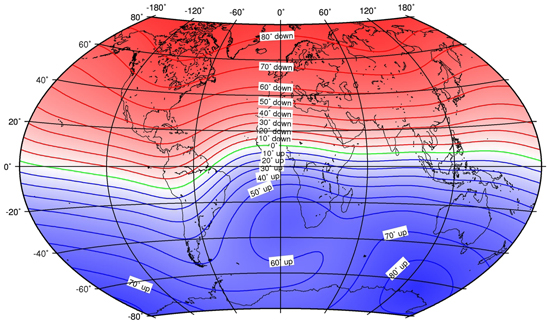 • Înclinaţia magnetică este dată de valoarea unghiului format de planul acului magnetic cu suprafaţa terestră (orizontala locului), aceasta fiind de 0° la Ecuator şi de aproximativ 90° la poli. Fenomenul este determinat de curbura Pământului şi de tendinţa acului magnetic al busolei de a se orienta spre Polul Nord (polul de atracţie).