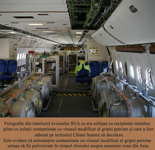 Fotografia de mai jos înfăţişează interiorul avionului respectiv ce era echipat cu butoaie metalice care conţineau soluţii contaminate cu virusul modificat al gripei porcine.