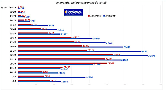 Din graficul de mai sus se poate vedea că vârsta la care se emigrează cel mai mult în România (la nivelul anului 2022) este de 30-34 de ani, urmată de grupele 20-24 de ani și 25-29 de ani.