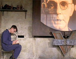 Acțiunea din romanul 1984 de George Orwell se desfășoară într-un viitor distopic – într-o peșteră alegorică. Telecranul, pe care îl puteți vedea mai jos, care transmite constant și, simultan, supraveghează totul neîncetat, este echivalentul umbrelor proiectate de către cei care îi țin închiși pe prizonieri – în acest caz, Partidul Interior. Majoritatea oamenilor din 1984 sunt proli (proletari); aceștia sunt echivalentul celor înlănțuiți în peșteră, forțați să accepte imaginile false ca fiind realitatea. Ei au fost prizonieri întreaga lor viață și nu își dau seama de faptul că sunt înlănțuiți. Cei din Partidul Exterior sunt aceia care au scăpat din lanțuri, dar sunt captivați de mesajele transmise de Telecran. Sunt atât de prinși de imaginile și poveștile create de cei care îi țin prizonieri, încât cred tot ceea ce li se arată, în loc să observe realitatea. Dacă pe Telecran li se spune că doi plus doi fac cinci, ei cred asta fără să își pună vreo întrebare.