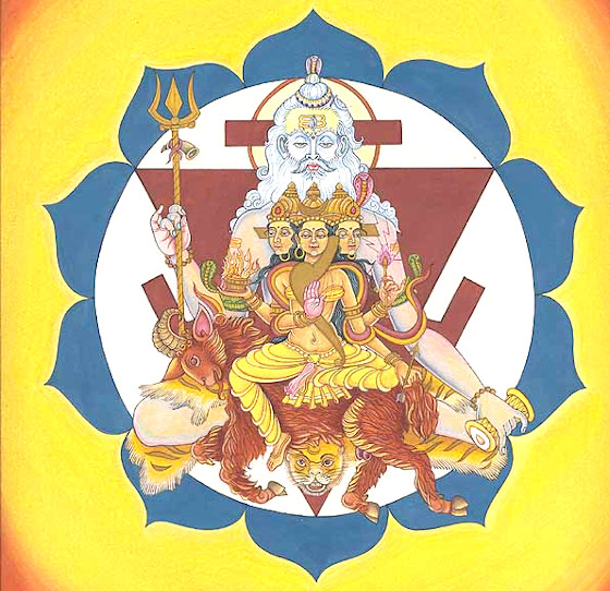 În mâna sa dreaptă, el ține un trident, care simbolizează controlul perfect a celor trei guna-uri: sattva, rajas și tamas. Se ştie că sattva guna, tendinţa ascendentă, corespunde purei esenţe a ființei umane (sat) şi totodată luminii Cunoaşterii dumnezeieşti (jnana), simbolizată prin strălucirea sferelor celeste care corespund stărilor superioare ale ființei, prin depăşirea dualității. Despre rajas guna putem spune, în schimb, că reprezintă tendinţa orizontală care provoacă expansiunea fiinţei, caracterizată prin activitate, dinamism și implicare. Tamas guna sau tendinţa descendentă este asimilată, la rândul ei, cu ignoranța spirituală (avidya), cu rădăcina stărilor inferioare şi a suferințelor de tot felul, cu inerţia, pasivitatea, cu latenţa şi cu forţa grosieră, nerafinată.