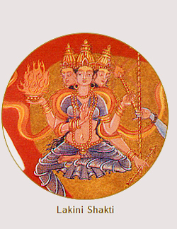 Lakini Shakti, energia feminină esențială de la nivelul lui manipura chakra are în reprezentările tradiționale trei capete, care simbolizează cunoaşterea perfectă a celor trei planuri: fizic, astral și cauzal. Prin natura specifică a elementului subtil foc pe care îl stăpâneşte, Lakini Shakti manifestă o deosebită libertate şi conferă aspirantului spiritual care o evocă cu o sinceră fervoare, puterea de a-și împlini intenţiile benefice cu forța și repeziciunea lui trăsnet (vajra).