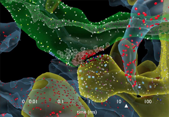 Pour faire cette estimation sur le cerveau, dix fois plus élevée que la précédente, les chercheurs du Salk Institute ont reproduit en 3D une petite partie de l’hippocampe de rats, région jouant un rôle fondamental dans la mémoire. Une infime partie même, puisque la zone reconstituée en 3D (voir vidéo ci-dessous) fait à peine la taille d’un globule rouge, soit quelques micromètres. On y voit neurones, synapses (zones de connexion entre neurones) et cellules gliales (jouant un rôle de soutien et de protection du tissu nerveux) de cette zone.