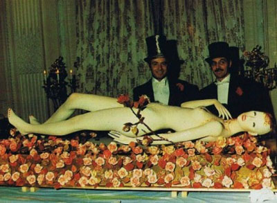 Pièce centrale du repas : vous noterez les représentations de bébés démembrés. Déjà à l’époque les stars singeaient leurs maîtres : et oui, les « gentils » Beatles aussi.