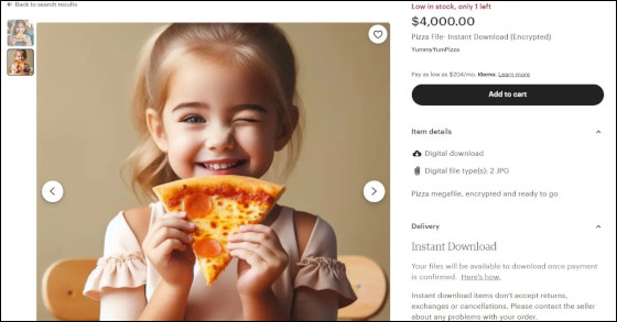O captură de ecran cu o reclamă, acum ștearsă, prezenta o „Pizza cu brânză și pepperoni” la prețul de 30.000 de lire sterline (aproximativ 37.649,10 dolari). O descriere spune: „Un JPEG frumos și aburind, delicios, al unei pizza cu pepperoni și brânză. Creată cu cele mai bune ingrediente din lume”. Cu siguranță, nimeni nu plătește mii de dolari pentru imagini cu pizza.