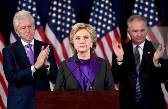 US Democratic presidential candidate Hillary Clinton makes a concession speech after being defeated by Republican presidential-elect Donald Trump as her running-mate Tim Kaine (R) and former president Bill Clinton look on in New York on November 9, 2016.
