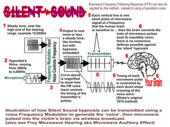 Ați auzit de tehnologia pe bază de microunde „Voice-To-Skull” (s-ar putea traduce în română ca fiind „Vocea din cap”)? Patent SUA 4,877,027 Brunkan – 31 octombrie, 1989. Sunetul este indus în capul unei persoane prin radiația exercitată asupra capului, cu microunde oscilând în intervalul de la 100 megahertzi până la 10.000 megahertzi, care sunt modulate cu o anumită formă de undă. Forma de undă constă în „explozii” de unde electromagnetice modulate prin frecvență. Fiecare serie/„explozie” este alcătuită din zece până la douăzeci de impulsuri distribuite uniform, grupate strâns împreună. Lățimea „exploziei” este între 500 nanosecunde și 100 microsecunde. Lățimea impulsului este cuprinsă între 10 nanosecunde și 1 microsecundă. „Exploziile” au frecvența modulată de semnalul audio pentru a crea senzații auditive la persoana al cărui cap este iradiat. Tipul „psiho-electronic” de control al minții despre care este vorba în acest caz este hărțuirea ascunsă și necontenită a cetățenilor nevinovați, care trăiesc în casele și comunitățile lor, și este răspândit în prezent în întreaga lume. Această hărțuire include atacurile mentale/trupești electronice, hărțuirea stradală, distrugerea relațiilor de familie și a altor relații și distrugerea carierei.