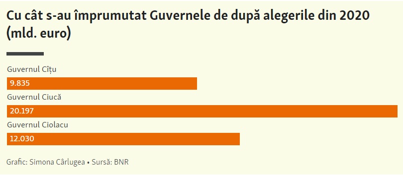Dacă analizăm situația, în funcție de cine a fost în fruntea guvernului, cei mai mulți bani, peste 20 de miliarde de euro, i-a împrumutat guvernul Ciucă.