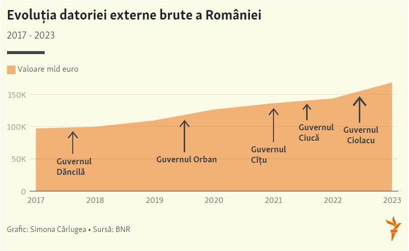 Datoria externă brută României a crescut, anul trecut, cu 17% față de 2022. Mai exact, cu 25 de miliarde de euro. Ceea ce înseamnă 1.315 euro pentru fiecare român, care se adaugă la datoriile făcute anii trecuți, care erau de 7.500 de euro la sfârșitul lui 2022.
