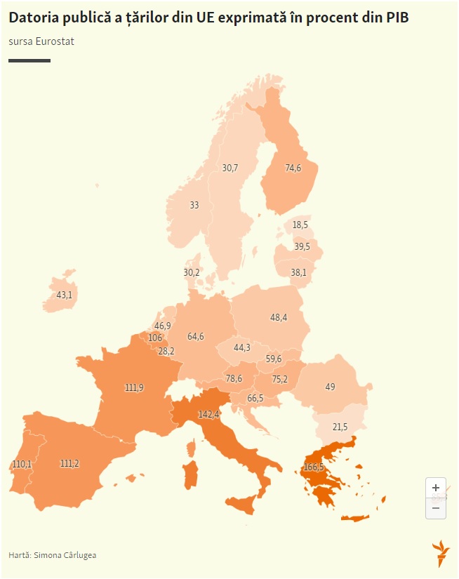 Grecia (166,5%) era pe primul loc, urmată de Italia (142,4%), Franța (111,9%), Spania (111,2%), Portugalia (110,1%) și Belgia (106,0%).