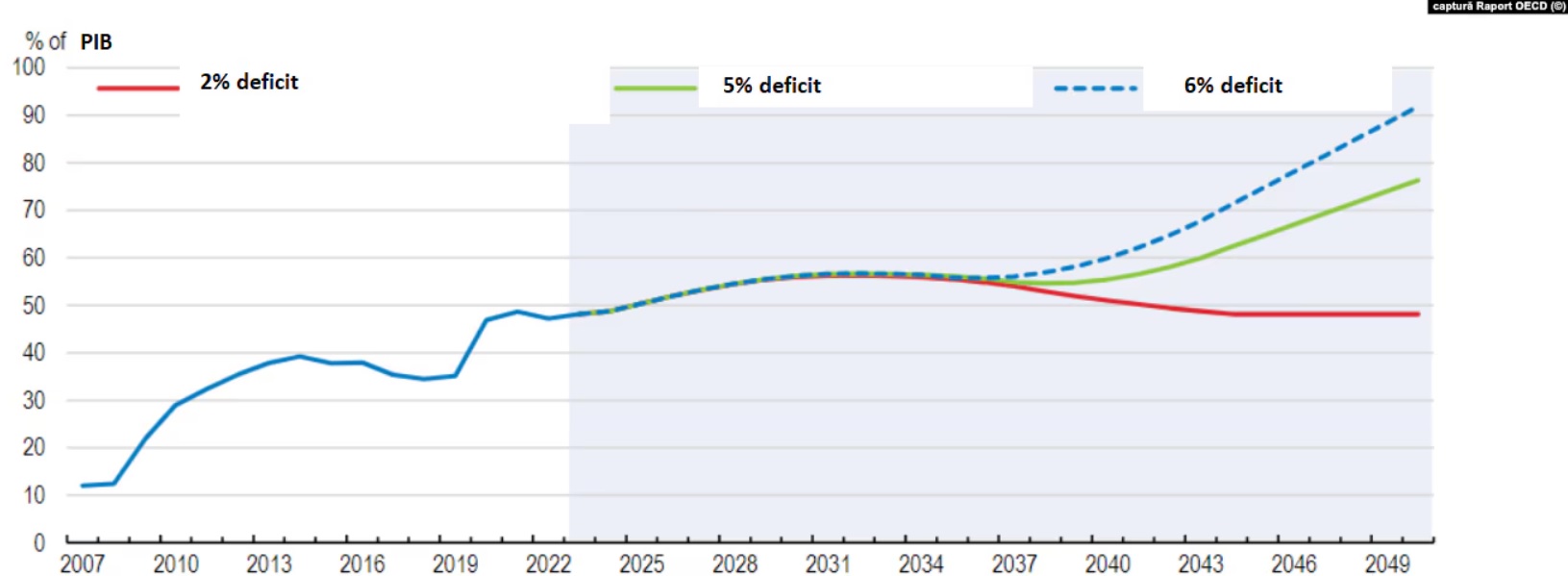 Iar proiecțiile OECD pe termen lung evidențiază problemele financiare pe care România le va avea dacă nu reușește să corecteze dezechilibrele fiscale actuale. La un nivel al deficitului apropiat de cel actual, în 2049, datoria publică a României ar putea ajunge la 90% din PIB.