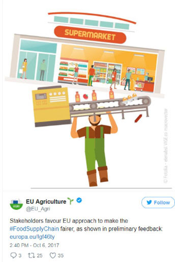 Pentru a face și mai clară poziția comisarului european, mai târziu în cursul acelei zile, adjunctul lui Phil Hogan a postat pe Twitter o imagine în care un fermier cară pe umeri povara unui „lanț trofic” la vârful ierarhic al căruia se află supermarketurile.