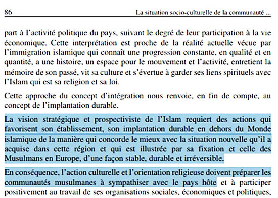 « Ce plan consiste à implanter des communautés islamiques civilisationnellement différente de l’Occident, qui fonctionnent selon les règles de la Charia, et qui ont pour vocation de prendre les postes-clés au niveau politique, économique et communicationnel dans les pays hôtes. La mise en œuvre de cette stratégie s’appuie sur les centres culturels, les mosquées, les écoles islamiques. »