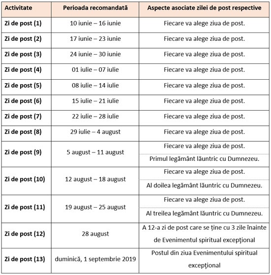 În vederea pregătirii pentru participarea la acest Eveniment spiritual excepţional, facultativ, fiecare participant poate opta să realizeze o suită de 12 zile de post negru în perioada premergătoare Evenimentului spiritual anunţat. Postul negru va fi realizat numai cu apă, timp de minim 24 de ore. La cele 12 zile de post negru preliminare se adaugă postul negru din ziua evenimentului (a 13-a zi de post), care se va încheia la trei ore după finalul acestui Eveniment spiritual excepțional. Toate cele 12 zile de post negru ce vor fi realizate de către fiecare în parte (precum şi cea de-a 13-a zi de post negru, ce se va realiza de către toţi participanţii în data desfăşurării evenimentului) vor fi consacrate în prealabil, într-un mod clar şi ferm, pentru participarea la acest eveniment, folosind în prealabil următoarea formulă: