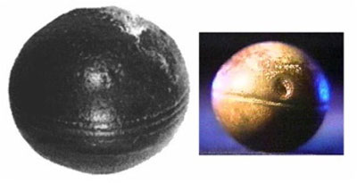 Here’s one of many truly amazing examples of high-tech excavated from prehistoric times! Spheroids were found in a silver mine at Western Transvaal, South Africa. Extracted from deep rock, around 1-4 inches in diameter, each spheroid has minute white fibers made of nickel-steel alloy not naturally occurring. The spheroids are estimated to be 2.8 billion years old by geological and radioactive isotope methods of dating. Even stranger, while sealed in a museum glass case, a spheroid is capable of slowly spinning on its axis independent of any outside intervention. If its thin shell is forced open it reveals a mysterious spongy material that turns to dust on exposure to the atmosphere.