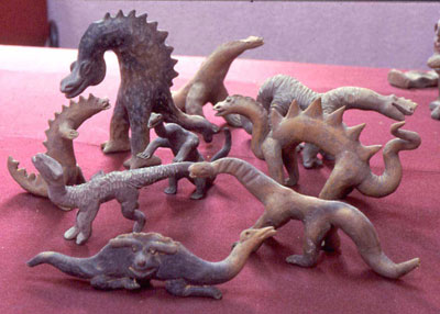 These small clay dinosaurs were found in 1945 by archaeologist Waldemar Julsrud in Guanajuato, Mexico, with thousands of other artefacts classed and dated as Chupicuaro pre-classic culture from 800 BC to 200 BC, but dinosaurs became extinct 65 million years ago!