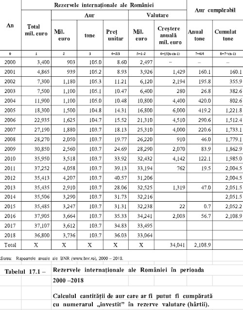 În ultimii 18 ani, adică în perioada 2000-2017, Banca Naţională a României a avut la dispoziţie pentru constituirea rezervelor internaţionale ale ţării suma de 34 miliarde de euro. Dacă ar fi folosit aceşti bani nu pentru cumpărarea de „hârtii”, pentru acordarea de împrumuturi unor guverne străine şi unor instituţii financiare internaţionale, ci pentru cumpărarea de aur, la sfârşitul anului 2017, rezerva de aur a României nu ar mai fi fost de 103,7 tone ci de 2.203,7 tone.