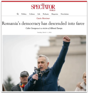 „Până acum șase luni, numele lui Georgescu era practic necunoscut în afara României. Apoi, Georgescu, în vârstă de 62 de ani, a obținut victoria în primul tur al alegerilor prezidențiale din noiembrie, un rezultat care a uimit sistemul politic european”, se arată într-o analiză a celei mai vechi publicații de limbă engleză din lume, britanica The Spectator World, fondată în 1828.