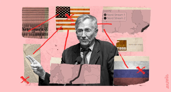 „Multă atenție a stârnit, de exemplu, jurnalistul american de 86 de ani Seymour Hersh, care acuză SUA pentru atacurile teroriste. O navă norvegiană ar fi introdus clandestin scafandri de luptă americani în Marea Baltică. Presupusul motiv: Rusia nu ar fi indicat să mai poată șantaja Germania cu livrările de gaze. Hersh nu a furnizat nicio dovadă în sprijinul teoriilor sale, iar părți importante din raportul său s-au dovedit ulterior false. Hersh și-a justificat teoriile susținând că o sursă de la Washington i-ar fi spus aceste informații. Guvernul rus, în orice caz, a fost încântat și a lăudat povestea nefondată ca dovadă că SUA au fost adevăratul instigator al războiului.”