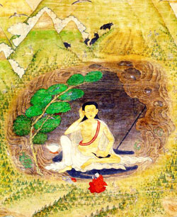 Milarepa este un mare yoghin tibetan care a trăit în secolele XI-XII. Este o figură foarte populară şi foarte iubită de tibetani, iar povestea vieţii sale este cea mai îndrăgită carte tibetană. Milarepa este celebru atât datorită ascezei extrem de severe pe care a urmat-o pentru a atinge desăvârşirea spirituală, cât şi datorită numeroaselor imnuri spirituale pe care le-a compus. „Sunt un yoghin care cântă de bucurie şi care nu doreşte o bucurie mai mare ca aceasta,” spunea Milarepa despre el însuşi. Pentru a simboliza faptul că el cânta imnuri, în iconografia tibetană el este întotdeauna reprezentat cu o mână adusă la ureche, într-un gest care sugerează ascultarea plină de atenţie.