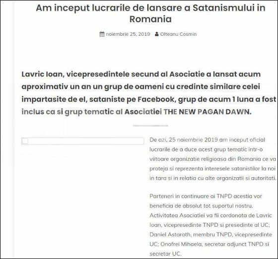 În 2019, Cosmin Olteanu publica pe site-ul propriu articolul „Am început lucrările de lansare a Satanismului în România”.