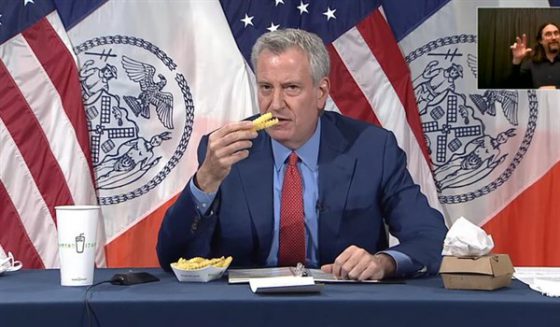 „Vreau să urmărești acești cartofi prăjiți și să te gândești cât de bine te vei simți după ce te vaccinezi”, a spus de Blasio în timp ce mânca în fața camerelor. „Mmmm… vaccinare”, a spus el după o mușcătura.