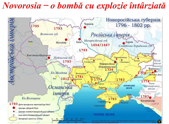 Desigur, nu este problema noastră a cui e Novorosia ‒ este problema slavilor de răsărit. Pentru noi este important că în 1917/18, ambele rudimente de statalitate ucraineană (naționalistă, Republica Populară Ucraineană, și sovietică, Republica Sovietică Ucraineană) au urmărit să anexeze Basarabia, precum și îndemnul de atunci al primului președinte al Radei de la Kiev (de altfel marele istoric ucrainean Mihailo Hrușevski): „Mutați-vă cu traiul în Basarabia. Basarabia trebuie să devină ucraineană.”([2], p. 42). Un nou val al migrației spre sud-vest a ucrainenilor se desfășoară astăzi sub acoperirea războiului lor și sub privirile noastre indolente.