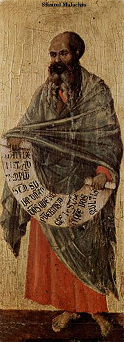 În ce îl priveşte pe Malachia, pe numele său laic Maolmhaodhog O’Morgair, acest mistic irlandez născut în 1094 şi canonizat în 1199 pentru sfinţenia sa, nu ştim prea multe despre, decât că a fost hirotonisit preot în 1119 şi că a devenit vicar de Armagh, apoi episcop de Connor în 1124. Cum părinţii săi îl puseseră sub patronajul ultimului proroc biblic, Malachia, era cumva firesc ca acest prenume să-l fi predestinat într-o oarecare măsură unei cariere de proroc al vremurilor din urmă. De fapt, „Cartea lui Malachia“ încheie „Vechiul Testament“, aşa cum „Apocalipsa lui Ioan“ încheie „Noul Testament“. Malachia şi Ioan par a fi predestinaţi să „încheie“ timpurile. După biografia sa foarte interesantă scrisă de Bernard de Clairvaux, Sfântul Malachia era cunoscut pentru puterea sa de a vindeca bolnavii şi mai ales pentru cea de a prezice viitorul. El şi-a prezis locul şi anul morţii, ca şi pe cele ale multor oameni cu care s-a întâlnit, ceea ce indică aptitudinea sa incredibilă de a „vedea“ viitorul şi destinul. La apogeul vieţii, el a luat hotărârea de a se retrage în mica dioceză de la începuturile călugăriei sale, Down, pentru a regăsi viaţa monastică cisterciană din tinereţe. Istoria ne spune că în 1139, în piaţa Sf. Petru, el a avut o viziune-extaz în legătură cu fiecare Papă ce urma să vină şi cu lucrarea lui, până la faimoasele vremuri din urmă (până la el fuseseră deja 165 de papi, primul fiind Sfântul Petru, „ales“ în ’67), caracterizate de distrugerea Romei. Pentru a complica lucrurile, lista sa nu a fost făcută publică decât la 452 de ani după moartea sa, adică în 1595, şi aceasta datorită bibliotecarului benedictin Arnold de Wion, care a transcris-o în dicţionarul, elaborat de el, al călugărilor din ordinul său, intitulat „Arborele vieţii“ sau „Lignum Vitaeornamentum et decus Ecclesiae“. Este vorba despre o simplă notă de dicţionar la litera D, despre dioceza Down: „Sfântul Malachia, irlandez, episcop de Down, călugăr în Bevehor şi arhiepiscop de Armagh. După ce a ocupat acest scaun mai mulţi ani, el l-a părăsit în anul Domnului 1137 şi s-a retras la locaşul din Down, unde a rămas până la sfârşitul vieţii sale. A murit la 2 noiembrie 1143, în conformitate cu viaţa sa descrisă de Sf. Bernard… Se spune că a scris el însuşi câteva opuscule, dar eu nu am văzut niciunul, cu excepţia unei anumite lucrări, numită «Profeţie despre suveranii pontifi». Pe aceasta, deoarece este scurtă, şi pentru că nu a fost niciodată, după câte ştiu, imprimată, şi deoarece mulţi vor să o cunoască, o reproduc în cele ce urmează.“