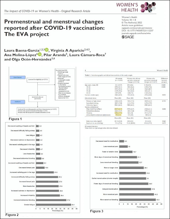 Baena-Garcia și colab. au raportat proiectul EVA, un studiu amplu (n=14.153) efectuat pe femei fără probleme de reproducere, la trei luni după vaccinarea împotriva covid-19. Autorii au informat: „Principalele modificări premenstruale raportate de femei după vaccinare sunt prezentate în Figura 2. Cele mai răspândite modificări legate de simptomele premenstruale au fost oboseala crescută (43%), balonarea abdominală (37%), iritabilitatea emoțională (29%), tristețe sau depresie (28%), dureri de cap (28%), disconfort la sâni (28%) și dificultăți de a adormi (27%).”