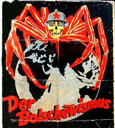 « Au début de 1935, les nazis déclenchaient une campagne anti-bolchevique, initiée par une série d’expositions itinérantes sur les dangers du communisme mondial. Cette affiche provient de l’exposition à Karlsruhe, la capitale de l’état allemand de Baden. Mais son imagerie se retrouve dans presque toutes les affiches de cette exposition. Ici le bolchévisme est représenté comme une énorme araignée rouge, dont la tête est le crâne familier grimaçant surmonté de l’étoile rouge. Assis en Union Soviétique, les jambes de l’araignée peuvent encore tendre la main pour menacer le monde entier. »
