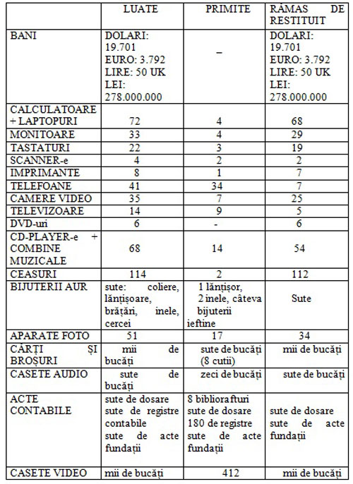 Pentru a vă face totuși o idee despre dimensiunea incredibilă a JAFULUI INSTITUȚIONALIZAT CE A FOST SĂVÂRȘIT ASUPRA YOGHINILOR postăm mai jos un tabel cu bunurile de valoare care au fost ridicate în cadrul acestor percheziții abuzive.