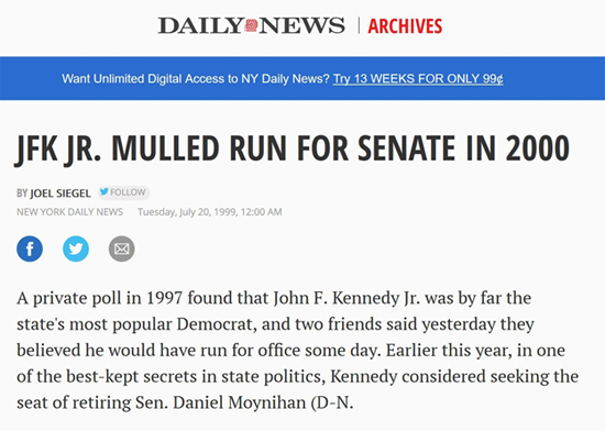 Selon un article du New York Daily News publié le 20 juillet 1999, JFK, Jr. prévoyait donc secrètement de se présenter au Sénat, bien qu’Hillary ait déjà déclaré sa candidature. D’après un sondage privé de 1997, « John F. Kennedy Jr. était de loin le démocrate le plus populaire de l’État », il est fort probable qu’il aurait réussi.