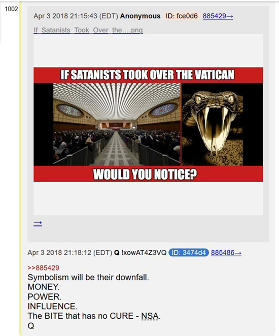 Le 3 avril, QAnon a fait le post suivant où il a joint une image postée par une autre source anonyme posant la question, « Si les satanistes prenaient le pouvoir au Vatican, le remarqueriez-vous ? »