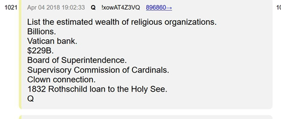 Dans une série de messages du mois d’avril, le dénonciateur anonyme QAnon a établi un lien important entre le Vatican, la famille Rothschild et le symbolisme reptilien. De nombreux adeptes de QAnon, qui tombent dans le camp des patriotes chrétiens, perçoivent le lien comme exposant une influence satanique d’un autre monde sur le Vatican : les Rothschild et d’autres forces constituant l’Etat profond.