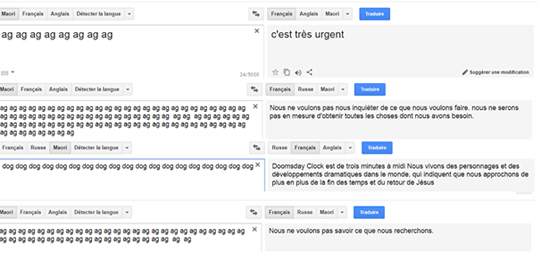 Par exemple, si on fait entrer 19 fois le mot « dog » et demandons de le traduire du māori au français, le système indique le texte suivant : « L’horloge de la fin du monde est de trois minutes à midi. Nous vivons des personnages et des développements dramatiques dans le monde, qui indiquent que nous approchons de plus en plus de la fin des temps et du retour de Jésus », peut-on lire.