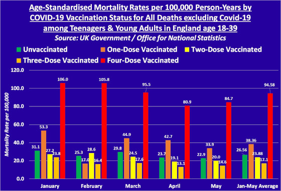 Date publicate recent de Oficiul de Statistică Națională (ONS) al Guvernului Regatului Unit indică faptul că tinerii cu vârste între 18 și 39 de ani care au primit patru doze de vaccin anti-covid au un risc cu până la 318% mai mare de a muri decât cei care nu au primit cele patru doze.