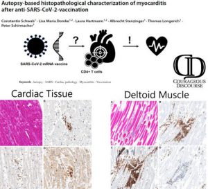 Interesant este faptul că 5 cazuri au avut miocardită acută drept cauză a decesului, histopatologia mușchiului cardiac prezentând o inflamație foarte asemănătoare cu cea observată în mușchiul deltoidian în care a fost injectat vaccinul cu ARNm, în ciuda propagandei oficiale care susține că miocardita de după vaccin nu poate provoca decesul și este foarte ușor tratabilă (vedeți Gheorghiță și alții).