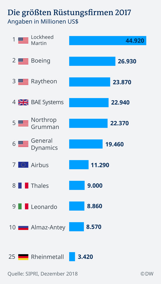 Firmele americane își împart între ele mai bine de jumătate din piața mondială de armament – acesta este rezultatul studiului actual realizat de institutul pentru cercetarea păcii de la Stockholm, SIPRI. Pe primul loc în top 100 mondial al producătorilor de arme se află grupul american Lockheed Martin. Niciun alt concern din această branșă nu a realizat profituri mai mari în 2017: volumul vânzărilor pentru Lockheed Martin este de 44 de miliarde de dolari, ceea ce plasează firma pe un incontestabil loc 1 în clasamentul SIPRI. Cea mai mare firmă germană în acest top, Rheinmetall AG din Düsseldorf, nu ajunge nici măcar la o zecime din performanțele celor de la Lockheed Martin. Rheinmetall se află pe locul 25, cu vânzări de 3,4 miliarde de dolari.