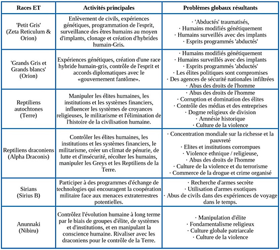 Tableau 1. Races extraterrestres coopérant avec le complexe militaro-industriel-extraterrestre