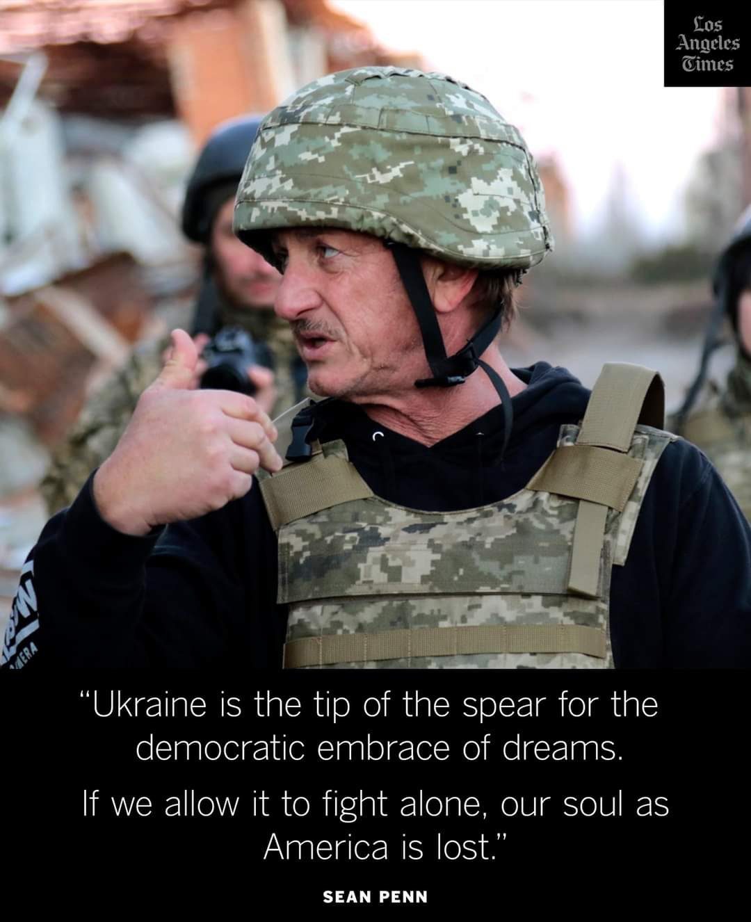 Ucraina este vârful de lance pentru îmbrățișarea democratică a viselor. Dacă îi permitem să lupte singură, sufletul nostru ca America este pierdut. Sean Penn