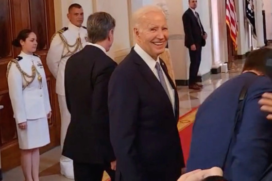 Biden s-a oprit din mers pentru o clipă înainte de a zâmbi și a chicoti, clătinând din cap în timp ce mergea pe hol.