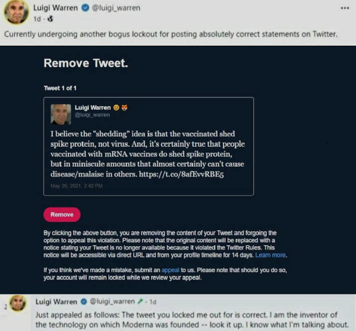 Twitter i-a șters „părintelui” tehnologiei ARNm o postare în care afirma că vaccinații pot răspândi proteina spike. „Informația este corectă, sunt inventatorul ei, știu despre ce vorbesc”, le-a răspuns, degeaba, Luigi Warren, cenzorilor de la Twitter.