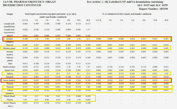 Puternica concentrație de proteine spike descoperită în testicule și ovare, potrivit datelor secrete Pfizer publicate de agenția de reglementare japoneză (grafic mai jos), ridică și o altă întrebare gravă: „Vor devenii tinerii noștri sterili?”, a spus Bridle.